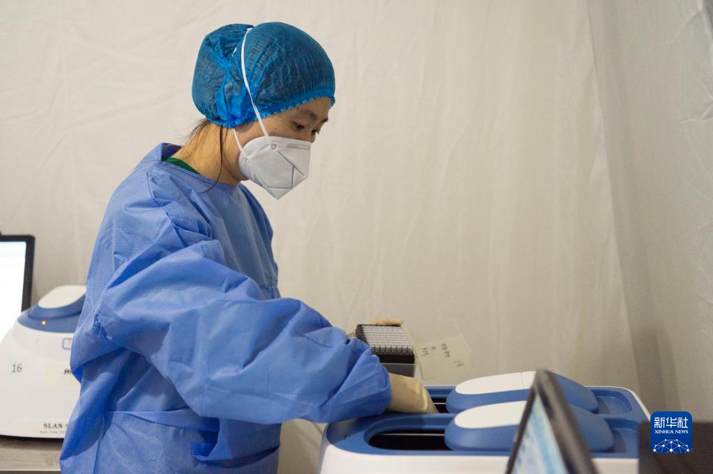 医务人员在位于哈尔滨国际会展体育中心内的哈尔滨市移动实验室工作(3月18日摄)。为应对当前新冠肺炎疫情,黑龙江省哈尔滨市的医务人员、志愿者、党员干部等防疫工作者坚守在疫情防控一线。他们岗位不同、年龄不一,却有着共同的目标——防止疫情传播,保障市民健康。新华社记者 谢剑飞 摄