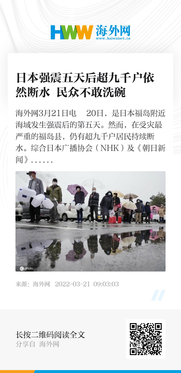 海外网3月21日电 20日,是日本福岛附近海域发生强震后的第五天。然而,在受灾最严重的福岛县,仍有超九千户居民持续断水。