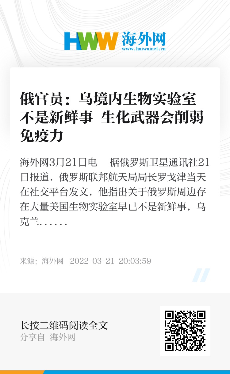 俄罗斯16日宣布乌克兰境内存在十几个实验室组成的网络,在五角大楼指导下开展军事生物计划,并在17日公布了从乌方实验室人员处获得的原始文件,证实这些实验室正在利用包括冠状病毒、炭疽病毒、高致病性禽流感病毒和非洲猪瘟等病原体进行实验。美国副国务卿纽兰8日曾在国会参议院听证会上承认,乌克兰有“生物研究设施”。 11日,五角大楼在官网上登出“情况说明”称,目的是销毁苏联时期遗留的不安全生物材料,降低遗留生物武器计划的风险。然而,福克斯新闻网对此提出了质疑,认为用17年来消灭生物武器,时间有些过长。(海外网 汪晓宇)