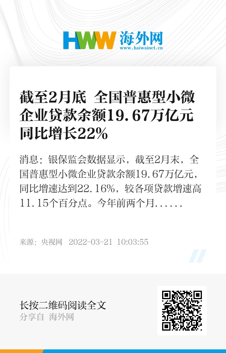 央视网消息:银保监会数据显示,截至2月末,全国普惠型小微企业贷款余额19.67万亿元,同比增速达到22.16%,较各项贷款增速高11.15个百分点。今年前两个月,全国新发放普惠型小微企业贷款利率5.57%,较2021年下降0.12个百分点。