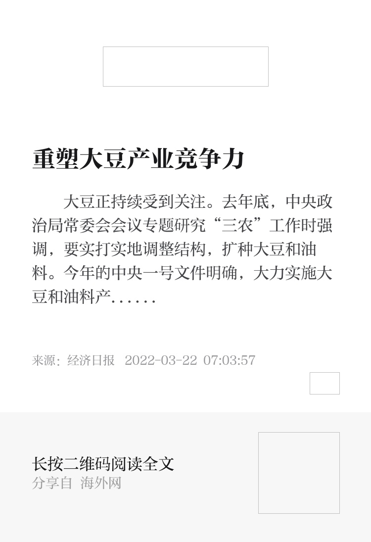 大豆发展开新局,关键是重塑行业竞争力。一是强政策。保产量的首要还是保面积。要完善大豆生产者补贴政策,充分考虑平衡玉米大豆种植收益,让农民种大豆不吃亏,自然愿意多种、套种、间种。二是强科技。这当然离不开培育高产大豆品种,但更重要的是,在推广已有优良品种上下功夫,在提高机械化率上做文章,从而提高单产、降低成本。三是强加工。加工上承种植、下启养殖,是吐纳产能的蓄水池。发展大豆加工业,要提高原料利用率,创新加工技术,针对食用大豆发力高档大豆蛋白产品,针对油用大豆提高压榨水平,从而提升价值链。(本文来源:经济日报 作者:乔金亮)