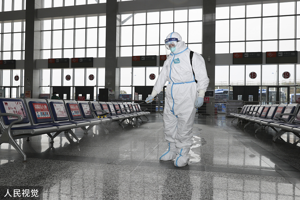 近日,江苏省连云港市低风险区域实行常态化疫情防控,恢复正常生产生活秩序。为保障复工复产需求,连云港市赣榆区组织消杀队对农贸市场、客运站、商业广场等重点公共区域进行全面消杀,保障人们出行安全。图源:人民视觉