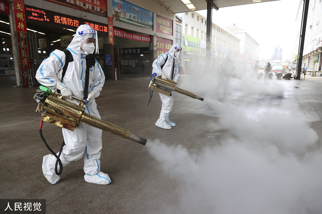 近日,江苏省连云港市低风险区域实行常态化疫情防控,恢复正常生产生活秩序。为保障复工复产需求,连云港市赣榆区组织消杀队对农贸市场、客运站、商业广场等重点公共区域进行全面消杀,保障人们出行安全。图源:人民视觉