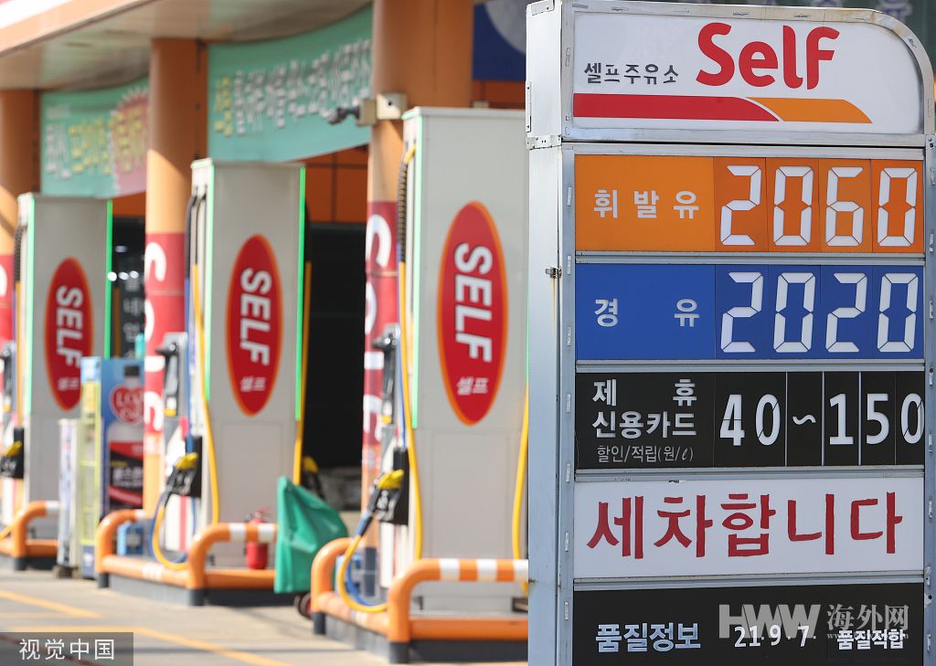 当地时间2022年3月22日,韩国首尔,当地加油站情景。国际油价暴涨,再次突破了110美元大关。美国WTI 4月原油期货收涨7.08%,报112.12美元/桶。(图:视觉中国)