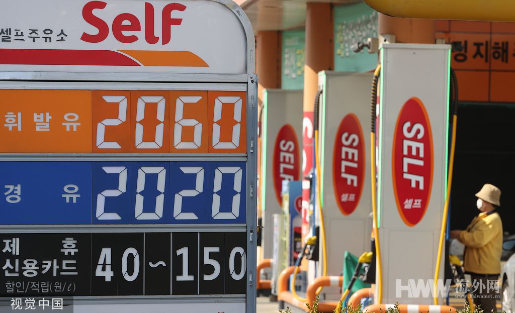 当地时间2022年3月22日,韩国首尔,当地加油站情景。国际油价暴涨,再次突破了110美元大关。美国WTI 4月原油期货收涨7.08%,报112.12美元/桶。(图:视觉中国)