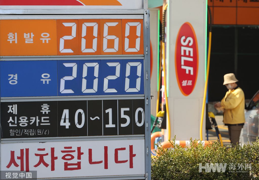 当地时间2022年3月22日,韩国首尔,当地加油站情景。国际油价暴涨,再次突破了110美元大关。美国WTI 4月原油期货收涨7.08%,报112.12美元/桶。(图:视觉中国)