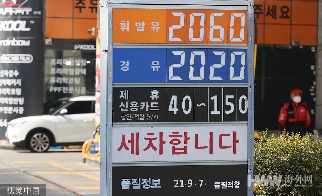 当地时间2022年3月22日,韩国首尔,当地加油站情景。国际油价暴涨,再次突破了110美元大关。美国WTI 4月原油期货收涨7.08%,报112.12美元/桶。(图:视觉中国)