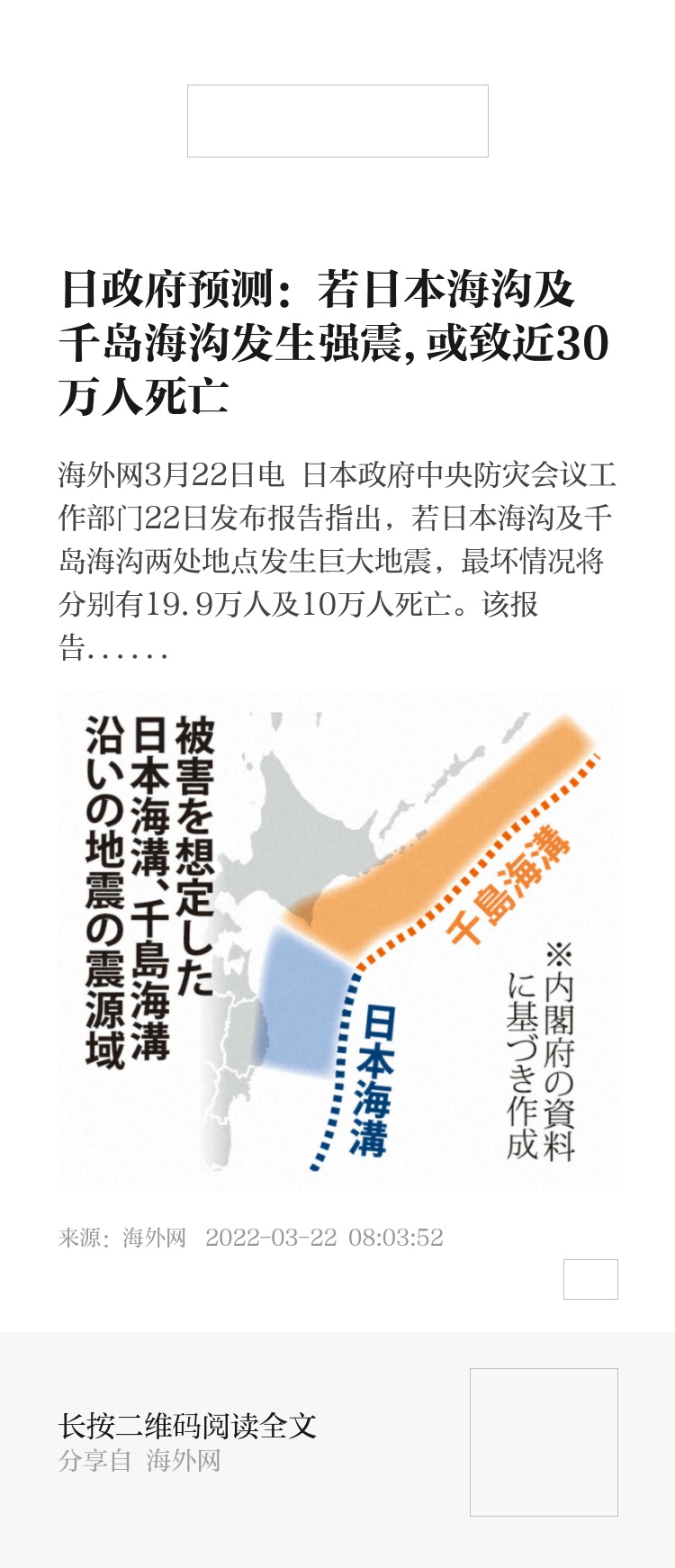 海外网3月22日电 日本政府中央防灾会议工作部门22日发布报告指出,若日本海沟及千岛海沟两处地点发生巨大地震,最坏情况将分别有19.9万人及10万人死亡。该报告表示,一旦上述地区发生了里氏7级以上强震,国家必须呼吁民众为后续更大的强震来袭而提前做好应对措施。