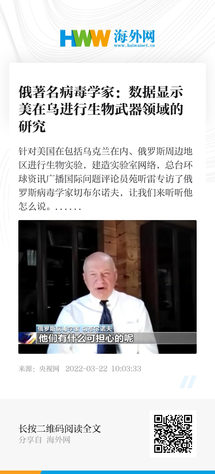 俄罗斯病毒学家 切布尔诺夫:这种表态本身已经足够让人震惊了,如果一个生物实验室长期从事科研,但从未公布过任何研究成果,那很有可能就是在从事军事目的研究,这是非常典型的特征。在我看来,纽兰女士已经说得很清楚了。一个这样高级别的美国官员如此担心这些资料会落入俄罗斯人手里。如果他们真的从事正常的研究,他们有什么可担心的呢?
