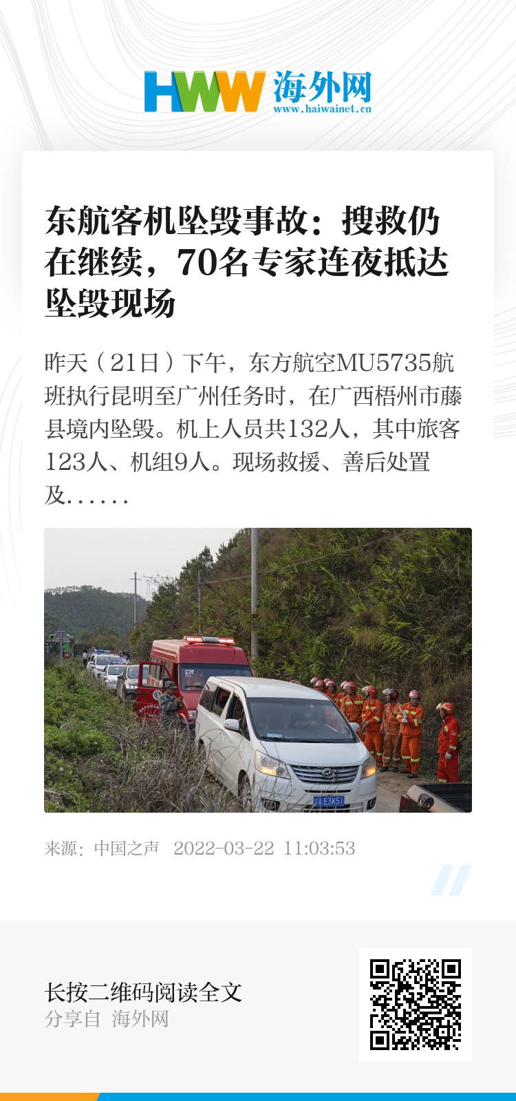 昨天(21日)下午,东方航空MU5735航班执行昆明至广州任务时,在广西梧州市藤县境内坠毁。机上人员共132人,其中旅客123人、机组9人。现场救援、善后处置及事故原因调查等工作正在进行中。
