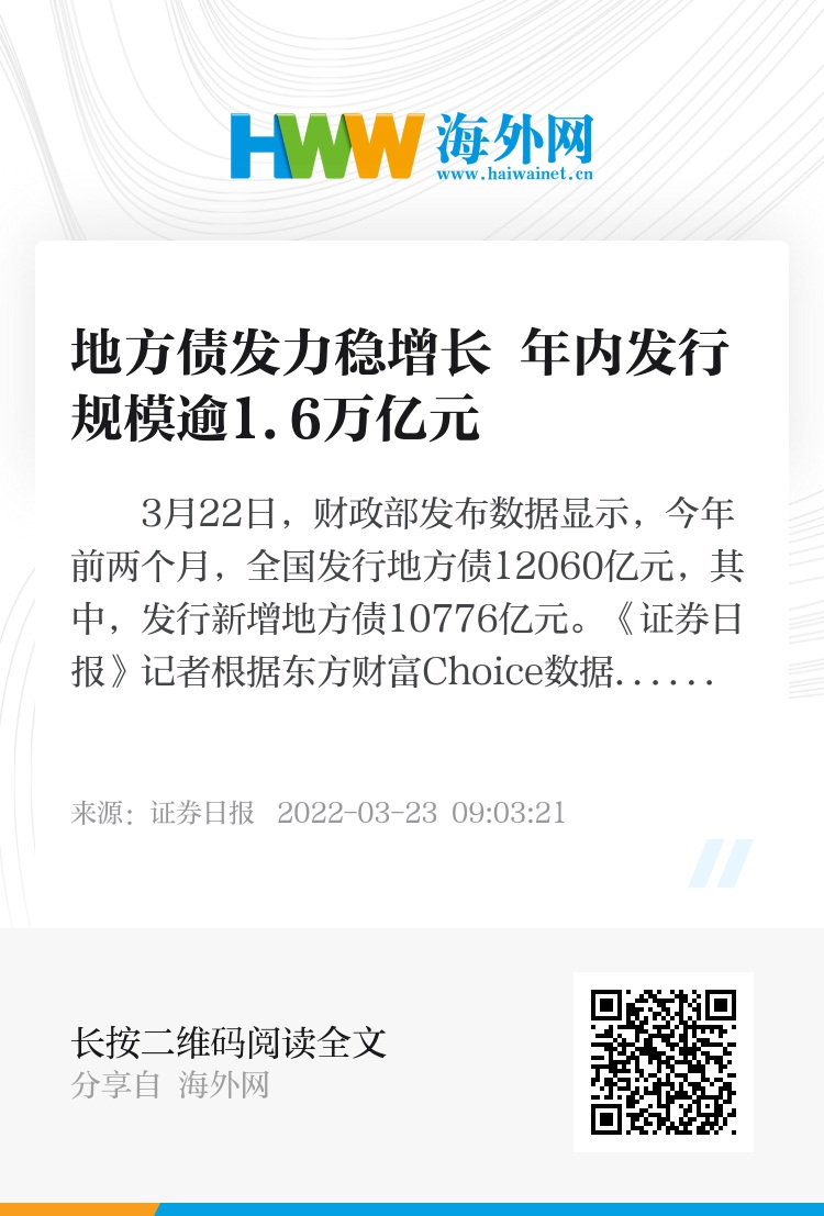 3月22日,财政部发布数据显示,今年前两个月,全国发行地方债12060亿元,其中,发行新增地方债10776亿元。《证券日报》记者根据东方财富Choice数据统计,截至3月22日,年内全国发行地方债16397亿元,其中新增地方债14328亿元。