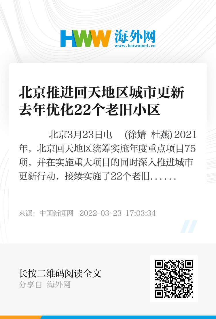 中新网北京3月23日电 (徐婧 杜燕)2021年,北京回天地区统筹实施年度重点项目75项,并在实施重大项目的同时深入推进城市更新行动,接续实施了22个老旧小区设施更新和环境优化,6条背街小巷完成整治提升,加装电梯28部,209个小区(村)完成智慧平安小区前端设备安装,1174处共享单车电子围栏启动建设。