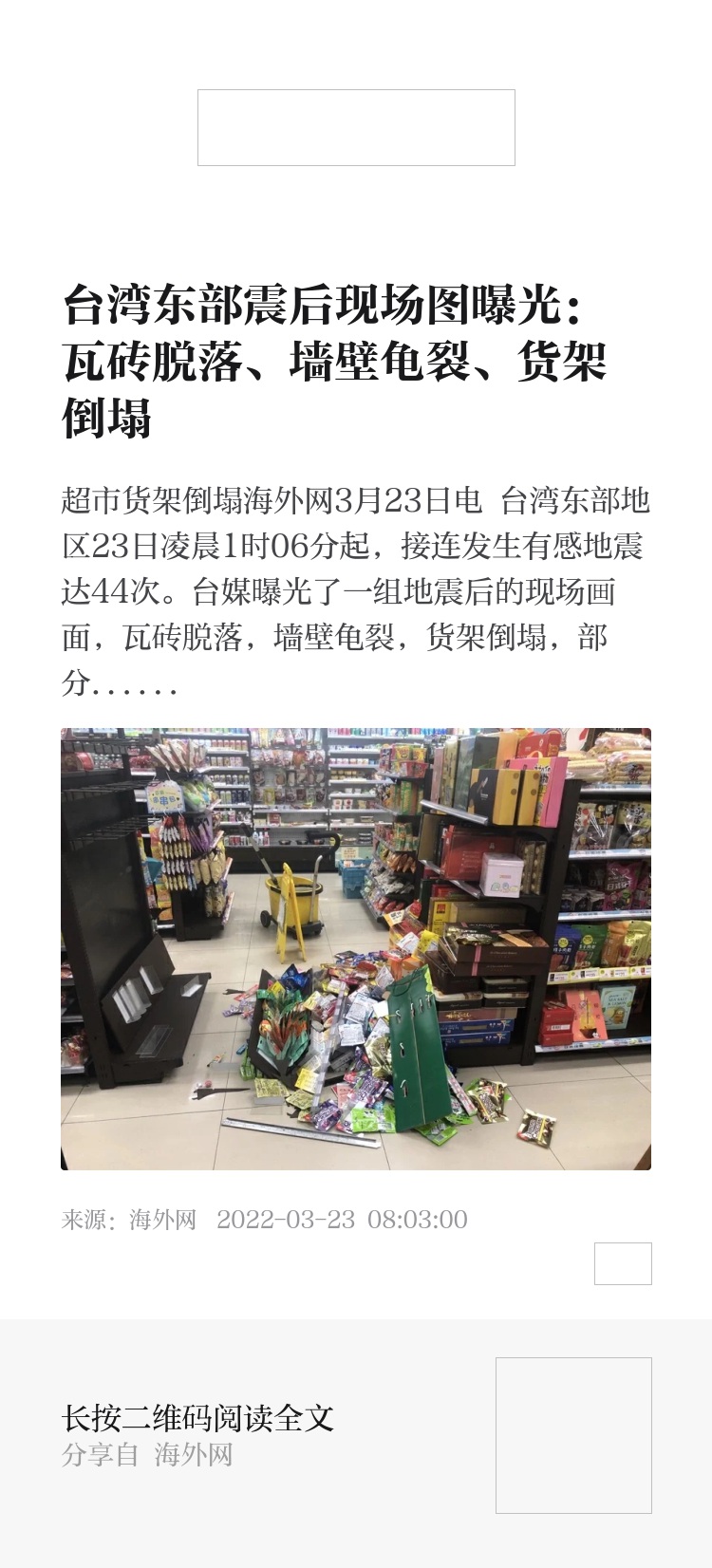 海外网3月23日电 台湾东部地区23日凌晨1时06分起,接连发生有感地震达44次。台媒曝光了一组地震后的现场画面,瓦砖脱落,墙壁龟裂,货架倒塌,部分公路也出现零星落石和裂痕。