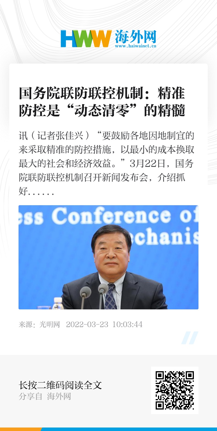 光明网讯(记者张佳兴)“要鼓励各地因地制宜的来采取精准的防控措施,以最小的成本换取最大的社会和经济效益。”3月22日,国务院联防联控机制召开新闻发布会,介绍抓好疫情防控工作有关情况。疫情应对处置工作领导小组专家组组长梁万年表示,精准防控实际上是“动态清零”的一个精髓,要真正实现“动态清零”,最关键的是要精准的防控。
