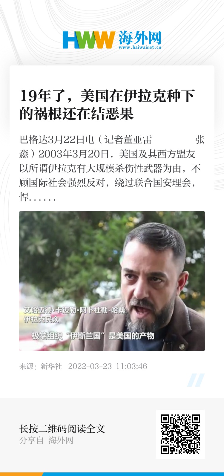 新华社巴格达3月22日电(记者董亚雷 张淼)2003年3月20日,美国及其西方盟友以所谓伊拉克有大规模杀伤性武器为由,不顾国际社会强烈反对,绕过联合国安理会,悍然入侵伊拉克。时至今日,美国也未拿出大规模杀伤性武器的证据。而这场战争导致伊拉克生灵涂炭,持续动荡,极端组织趁乱坐大,恐怖袭击和教派冲突频发。