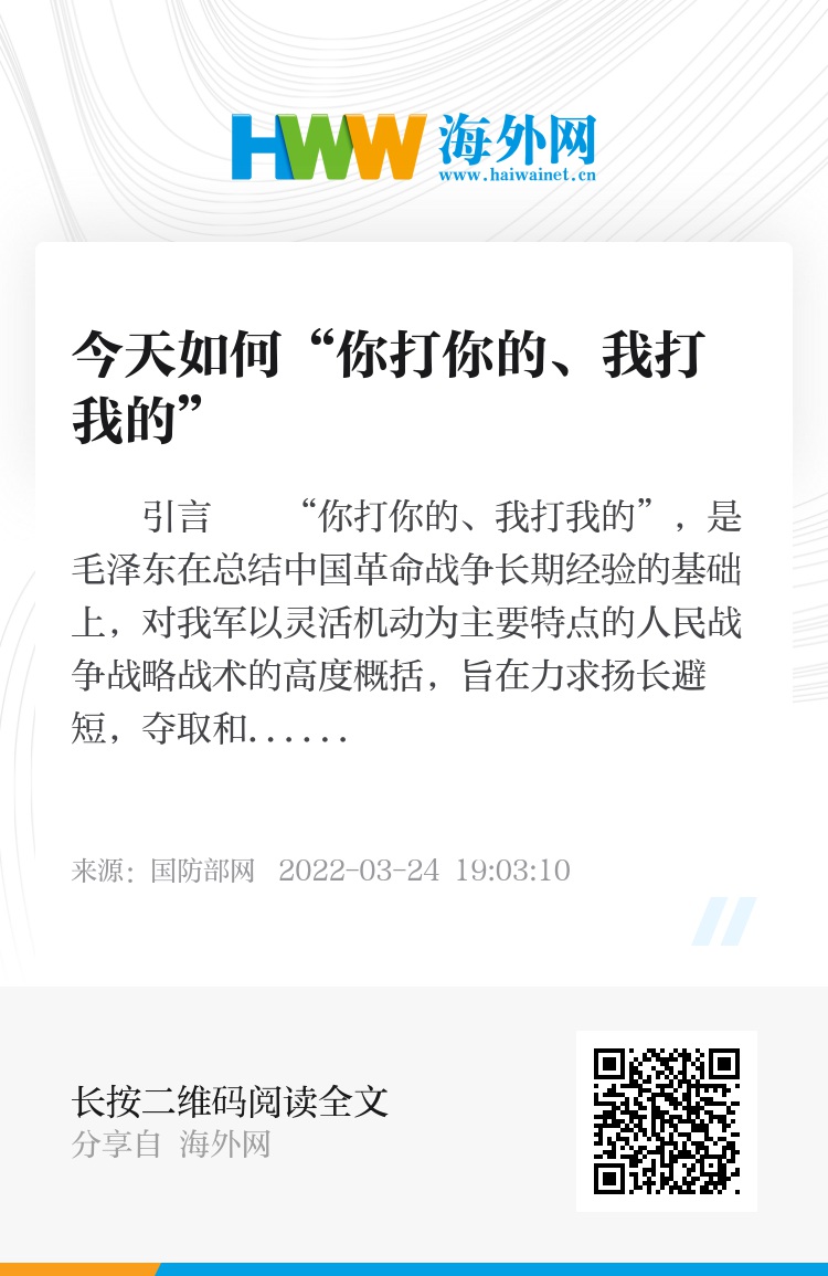 “你打你的、我打我的”,是毛泽东在总结中国革命战争长期经验的基础上,对我军以灵活机动为主要特点的人民战争战略战术的高度概括,旨在力求扬长避短,夺取和掌握主动权,它是我军人民战争战略战术的精髓,曾指导我军战争实践并取得了辉煌胜利。未来信息化智能化战争时代,“你打你的、我打我的”依然是战场制胜重要法则。