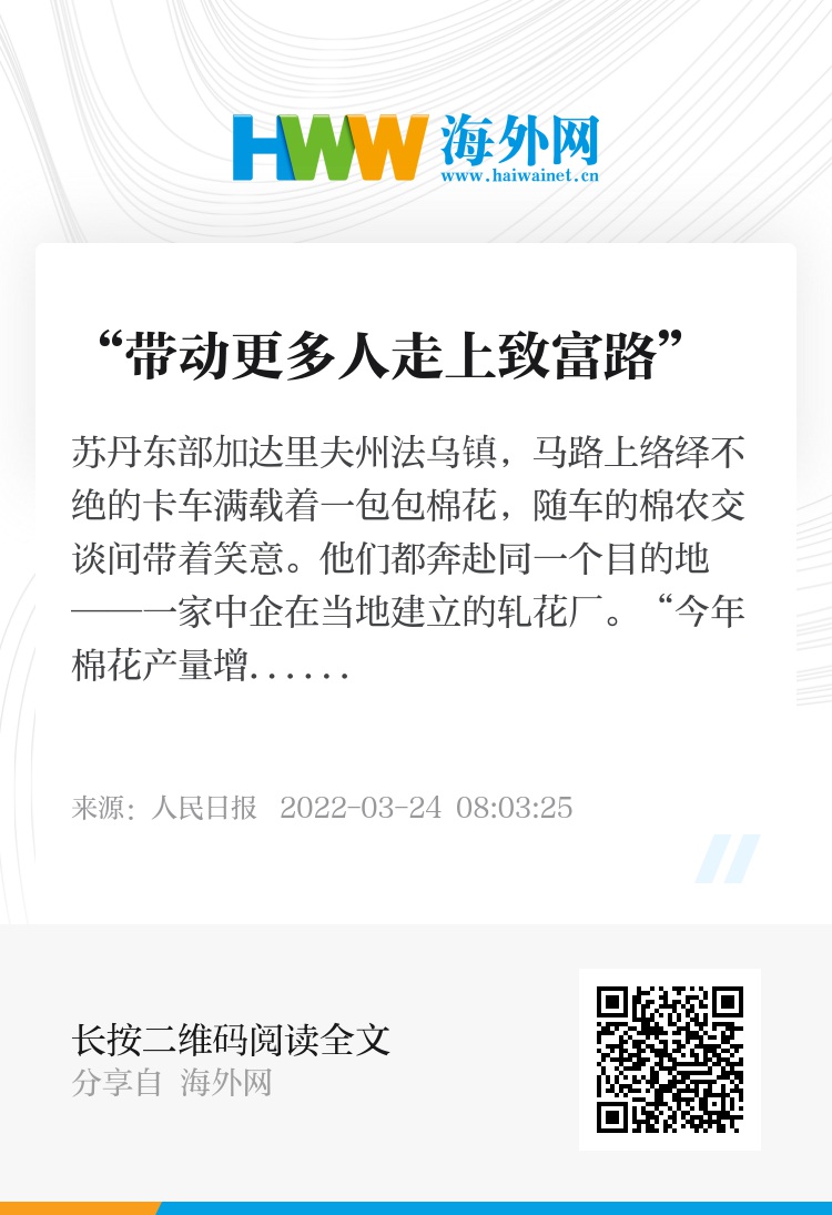 据了解,中企通过改善棉花品种、资助农户种植、打通销售渠道,根据当地的土地、水源、光照等情况给予技术指导等方式,帮助当地农民脱贫致富。“苏丹农业具有很大发展潜力,我们计划在棉花合作种植成功的基础上,拓展蓖麻等经济作物种植,希望能够帮助更多当地农民过上好日子。”公司负责人田中华说。