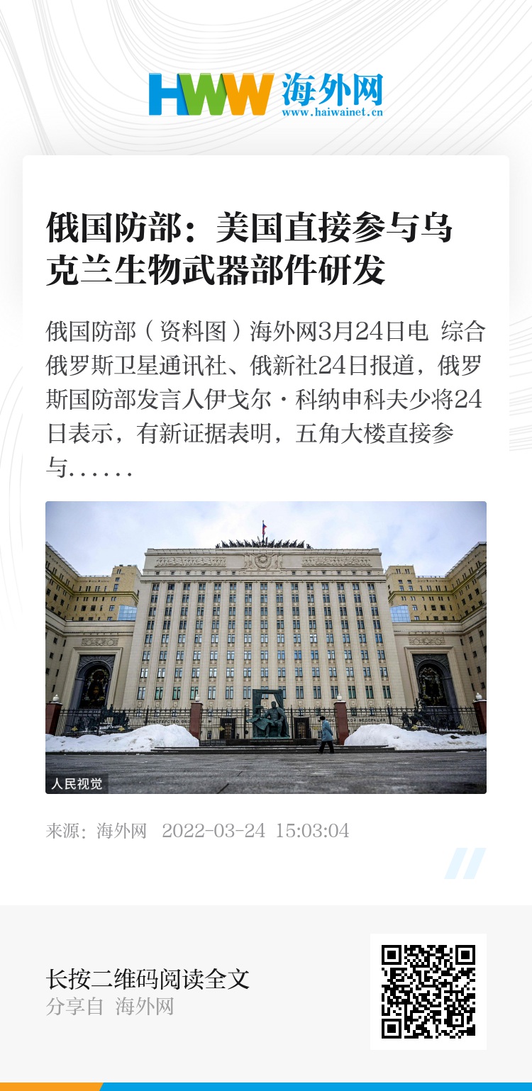 海外网3月24日电 综合俄罗斯卫星通讯社、俄新社24日报道,俄罗斯国防部发言人伊戈尔·科纳申科夫少将24日表示,有新证据表明,五角大楼直接参与了乌克兰生物武器部件的研发。