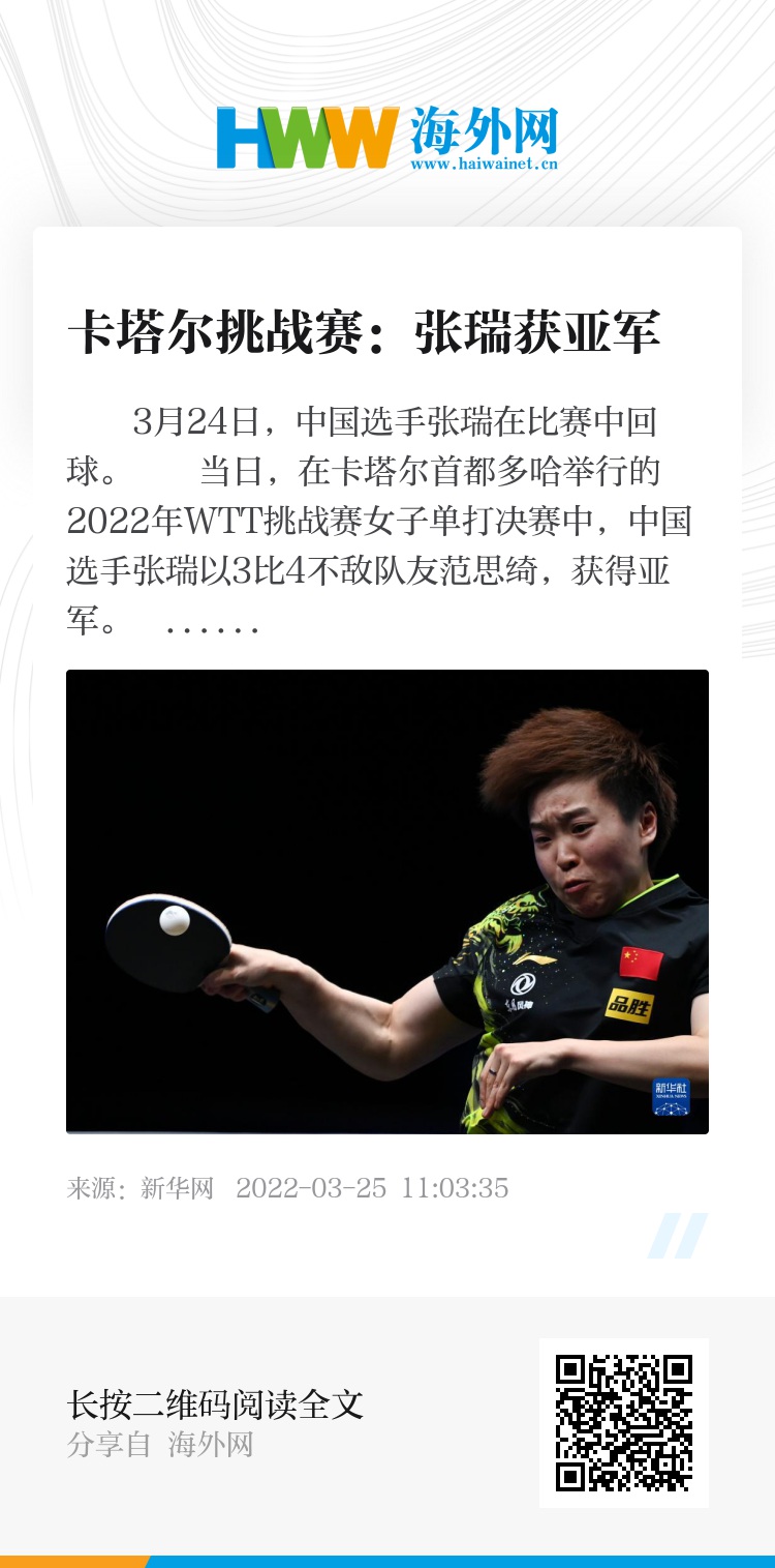 当日,在卡塔尔首都多哈举行的2022年WTT挑战赛女子单打决赛中,中国选手张瑞以3比4不敌队友范思绮,获得亚军。