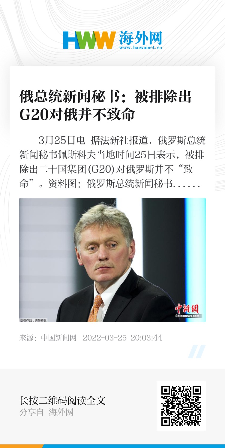 中新网3月25日电 据法新社报道,俄罗斯总统新闻秘书佩斯科夫当地时间25日表示,被排除出二十国集团(G20)对俄罗斯并不“致命”。