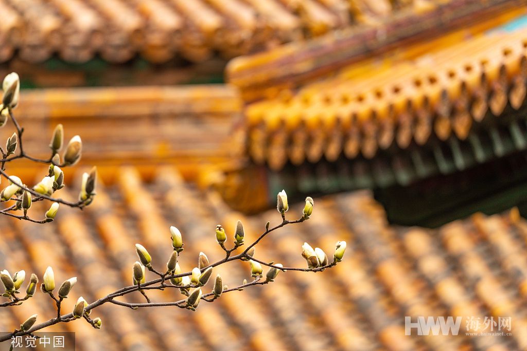 2022年3月25日,北京,春天的故宫御花园,一片春意盎然。玉兰花与宫殿琉璃瓦(宋宇/视觉中国)
