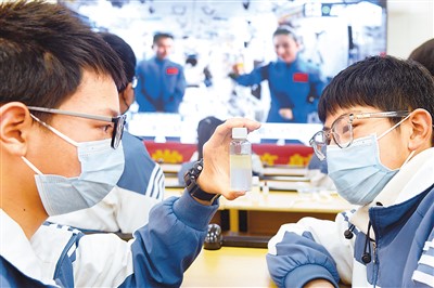 3月23日,“天宫课堂”第二课开课,安徽省六安市青山路初中的同学们收看航天员教学并开展实验,观察实验效果。田凯平摄(人民图片)