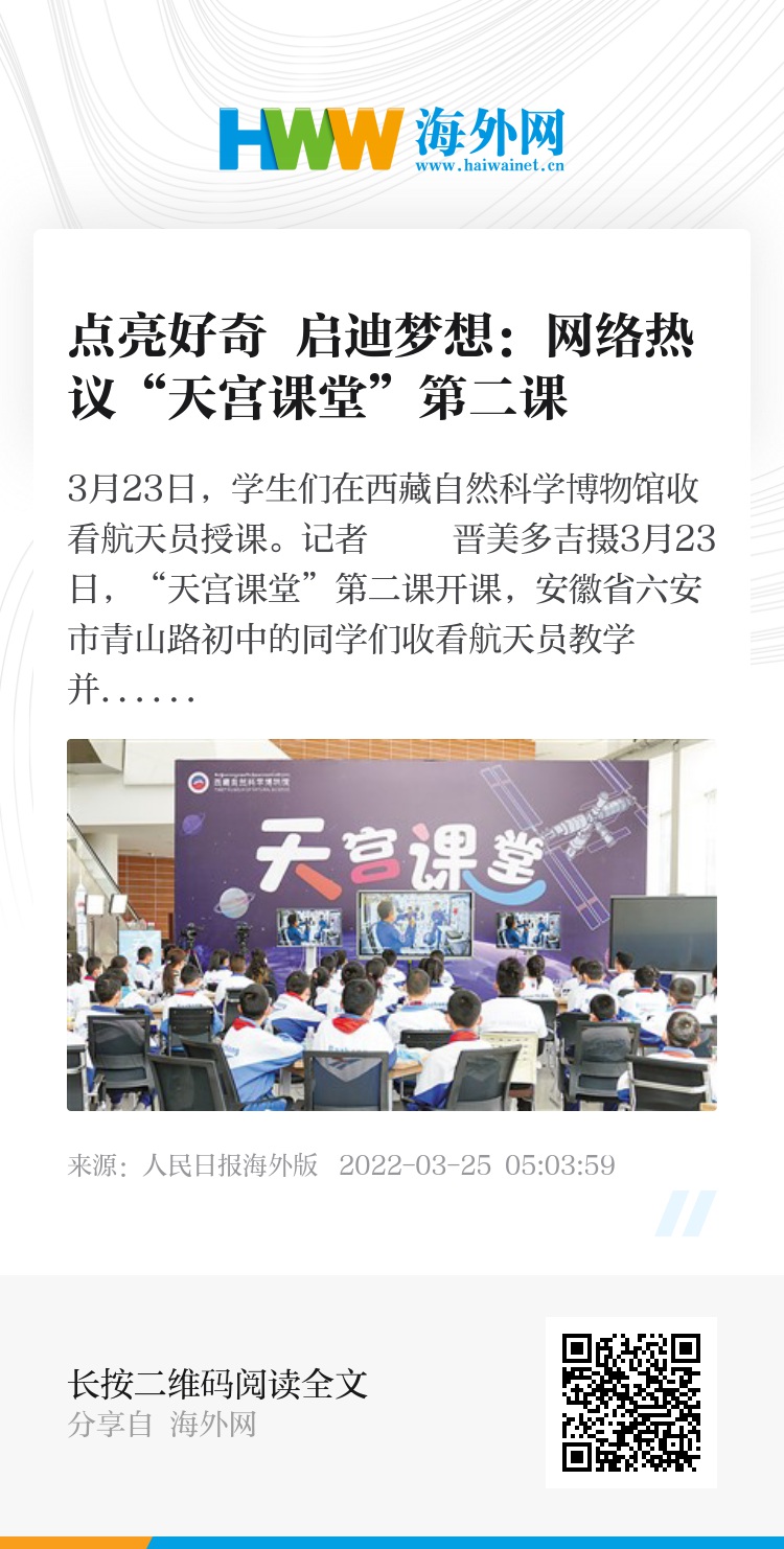 在“天宫课堂”第二课开讲之际,3月23日,新华网发布文章《天宫课堂丨你还记得亚平老师的课吗?》,带着网友一起复习“天宫课堂”第一课的内容:2021年12月9日,“天宫课堂”第一课在中国空间站正式开讲,神舟十三号乘组航天员翟志刚、王亚平、叶光富在空间站进行太空授课。干货满满的授课活动中,三位“太空教师”演示了微重力环境下细胞学实验、人体运动、液体表面张力等神奇现象,并讲解了实验背后的科学原理。