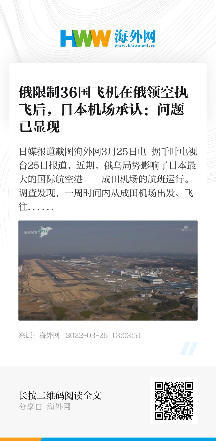 海外网3月25日电 据千叶电视台25日报道,近期,俄乌局势影响了日本最大的国际航空港——成田机场的航班运行。调查发现,一周时间内从成田机场出发、飞往欧洲的航班被取消超过50%。成田机场公司发声表示,问题已经显现。