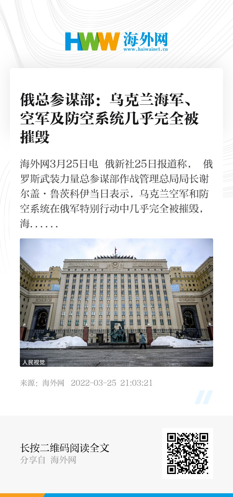 海外网3月25日电 俄新社25日报道称, 俄罗斯武装力量总参谋部作战管理总局局长谢尔盖·鲁茨科伊当日表示,乌克兰空军和防空系统在俄军特别行动中几乎完全被摧毁,海军已经不复存在。