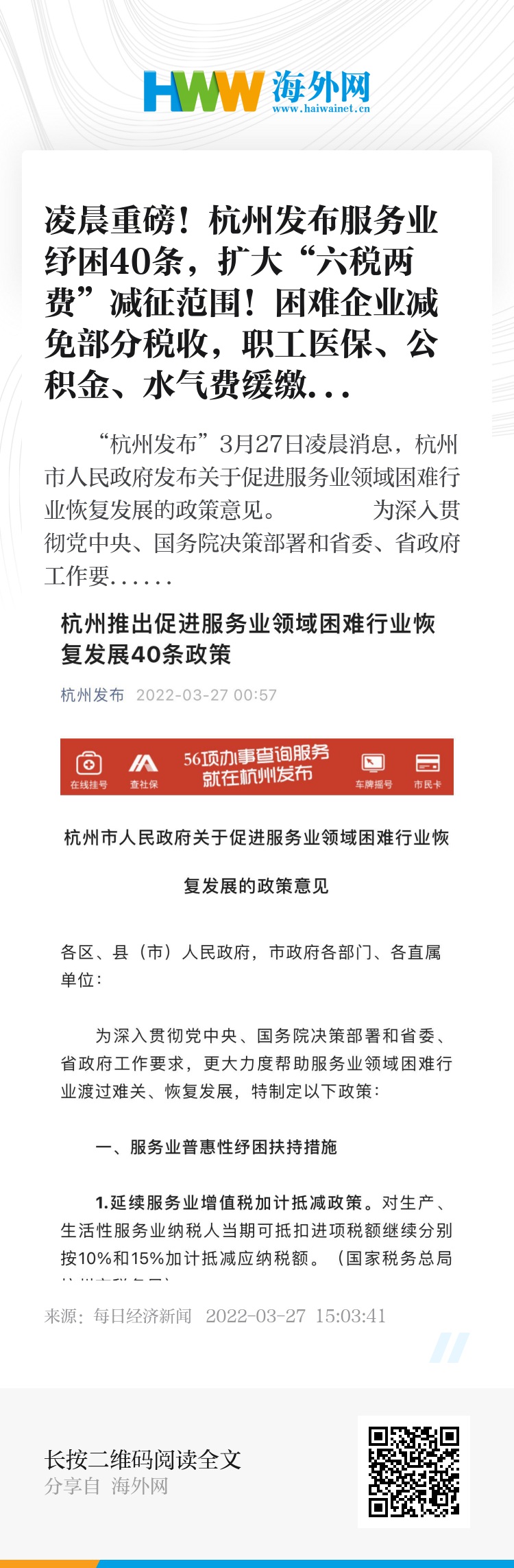 “杭州发布”3月27日凌晨消息,杭州市人民政府发布关于促进服务业领域困难行业恢复发展的政策意见。