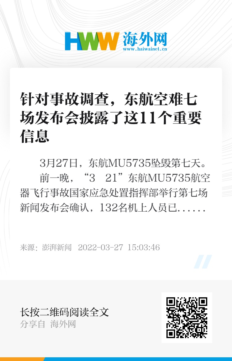 3月21日事故发生后,自3月22日至26日,5天内,国家应急处置指挥部共举行七场新闻发布会,就此次空难的搜救进展及事故调查情况对外通报信息。针对事故的调查进展,梳理这七场新闻发布会内容,有11个重要信息值得关注。
