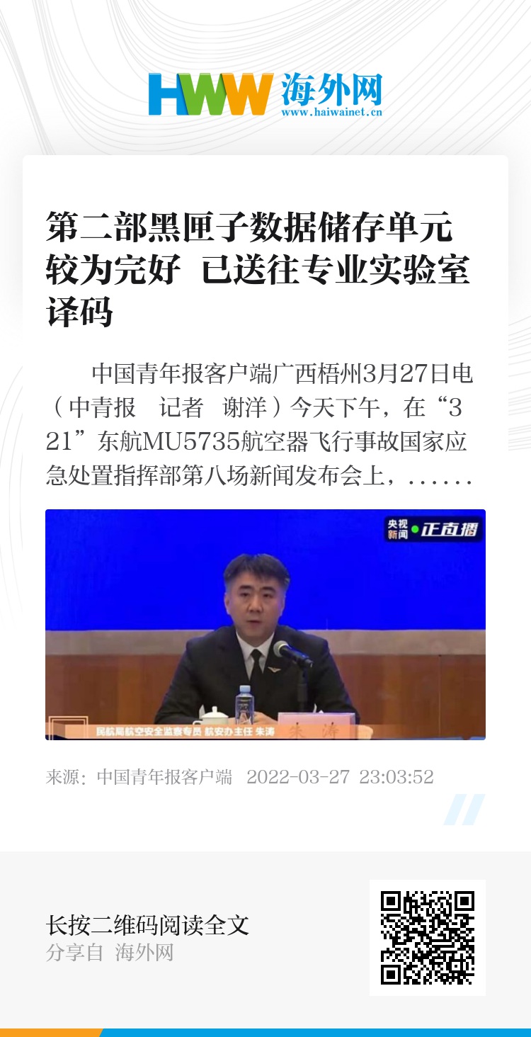 中国青年报客户端广西梧州3月27日电(中青报・中青网记者 谢洋)今天下午,在“3・21”东航MU5735航空器飞行事故国家应急处置指挥部第八场新闻发布会上,中国民用航空局航空安全办公室主任朱涛通报,3月27日9时20分左右,消防救援人员在技术组指定的重点区域深度搜寻,人工挖掘出一橙色圆柱状物体。经现场勘查的民航事故调查人员确认为飞行数据记录器(俗称“黑匣子”)的存储单元,经检查记录器其他部分损毁严重,数据储存单元较为完好。