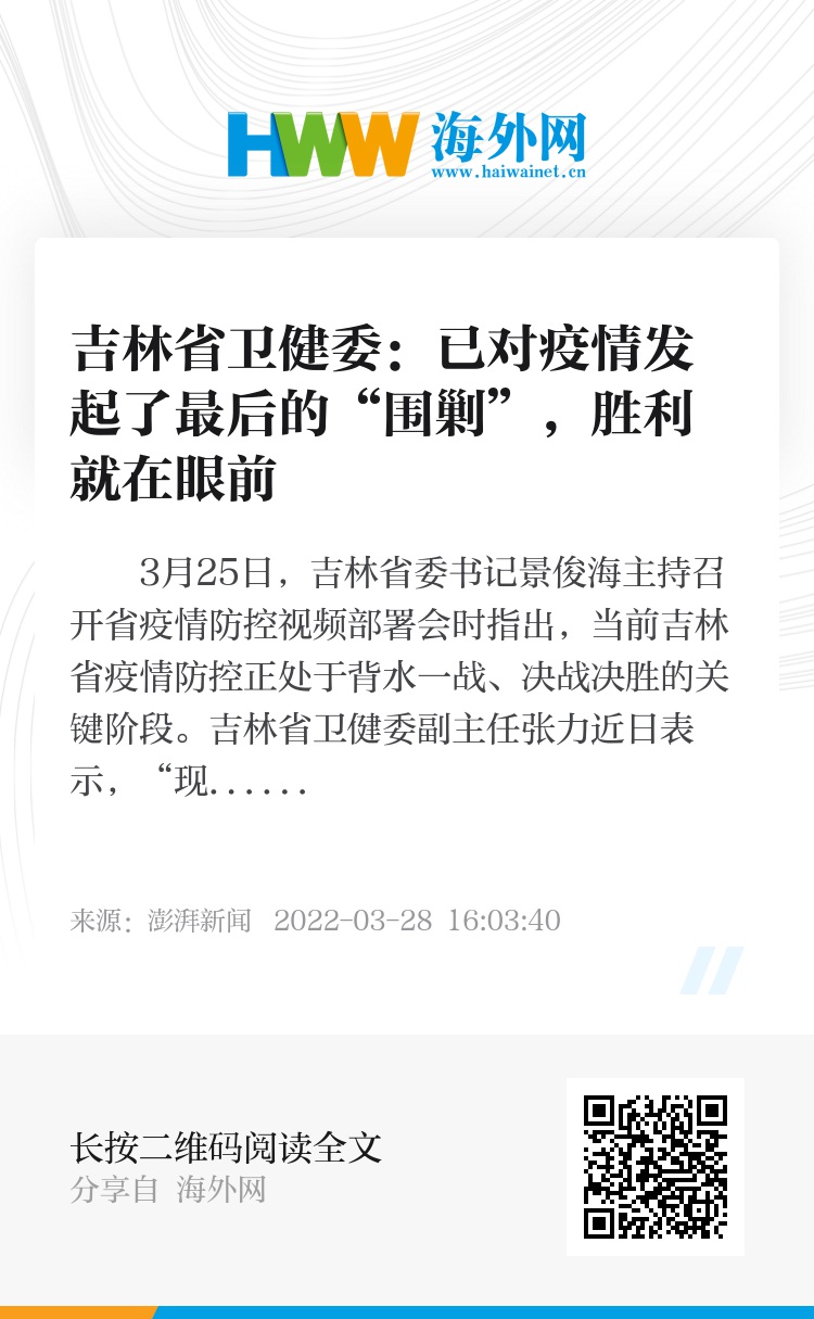 3月25日,吉林省委书记景俊海主持召开省疫情防控视频部署会时指出,当前吉林省疫情防控正处于背水一战、决战决胜的关键阶段。吉林省卫健委副主任张力近日表示,“现在抗疫到了最紧要关头、最关键时刻,我们已经对疫情发起了最后的‘围剿’,胜利就在眼前。”