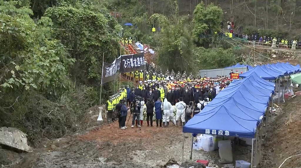 3月27日下午,广西梧州,“3·21”东航MU5735航空器飞行事故遇难者集体哀悼活动在事发地搜救现场举行,对遇难者表示哀悼。图片来源:视频截图