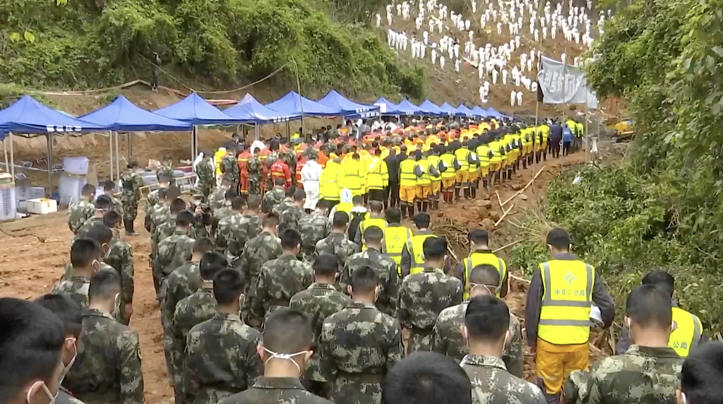 3月27日下午,广西梧州,“3·21”东航MU5735航空器飞行事故遇难者集体哀悼活动在事发地搜救现场举行,对遇难者表示哀悼。图片来源:视频截图