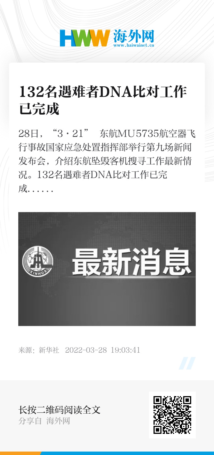 记者从28日下午的“3·21”东航MU5735航空器飞行事故国家应急处置指挥部第九场新闻发布会上获悉,目前132名遇难者的DNA比对工作已完成,遗骸遗物移交方案和分类移交标准正在逐步完善。