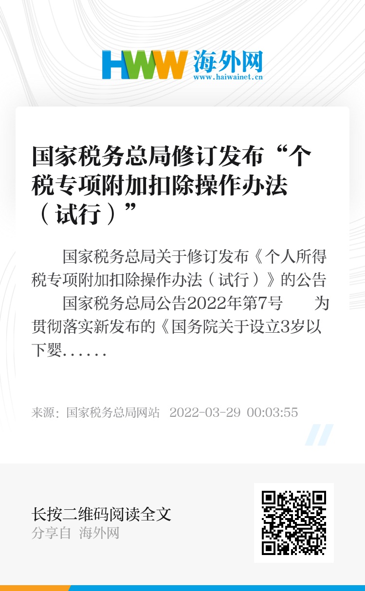 为贯彻落实新发布的《国务院关于设立3岁以下婴幼儿照护个人所得税专项附加扣除的通知》(国发〔2022〕8号),保障3岁以下婴幼儿照护专项附加扣除政策顺利实施,国家税务总局相应修订了《个人所得税专项附加扣除操作办法(试行)》及《个人所得税扣缴申报表》。现予以发布,自2022年1月1日起施行。《国家税务总局关于发布〈个人所得税专项附加扣除操作办法(试行)〉的公告》(2018年第60号)、《国家税务总局关于修订个人所得税申报表的公告》(2019年第7号)附件2同时废止。