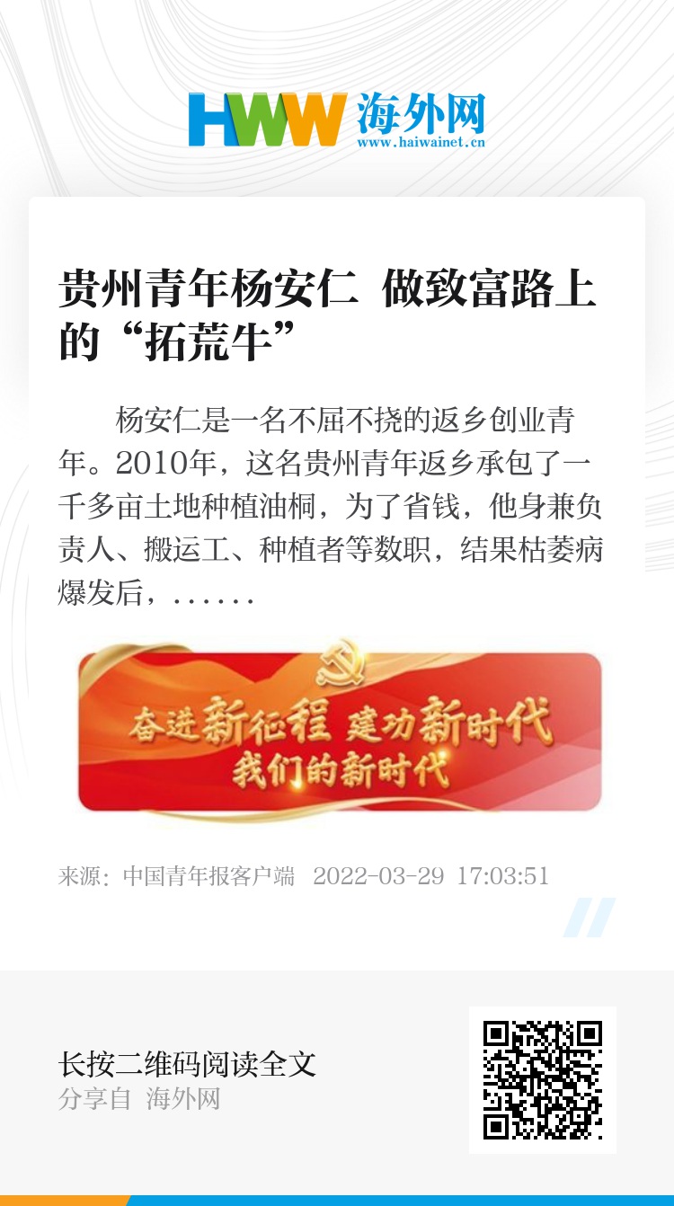杨安仁是一名不屈不挠的返乡创业青年。2010年,这名贵州青年返乡承包了一千多亩土地种植油桐,为了省钱,他身兼负责人、搬运工、种植者等数职,结果枯萎病爆发后,所有油桐树全部死亡。2016年,他第一次参加了共青团中央组织的“创青春”大学生创新创业大赛,大赛中评审专家的指点,让杨安仁认识到科技对行业发展的重要性并逐步向科技型企业转型。通过不懈努力,杨安仁将一座座荒山变绿,实现3万亩基地建设、6万亩基地待开发的规模。