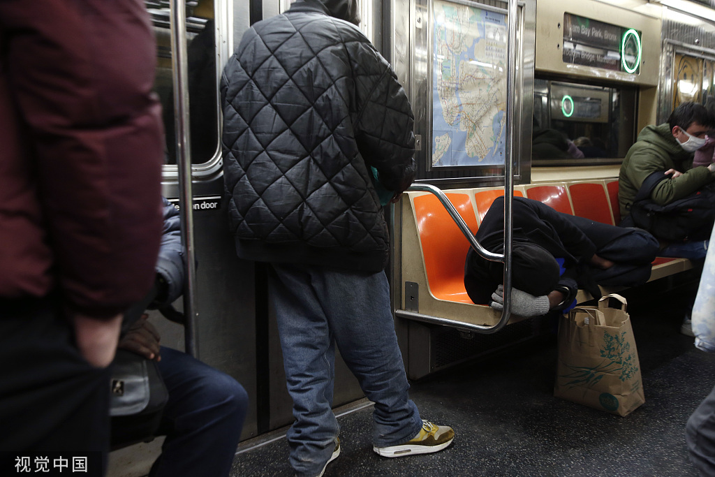 当地时间2022年2月27日,美国纽约曼哈顿,当地流浪汉在地铁里睡觉。图片来源:视觉中国
