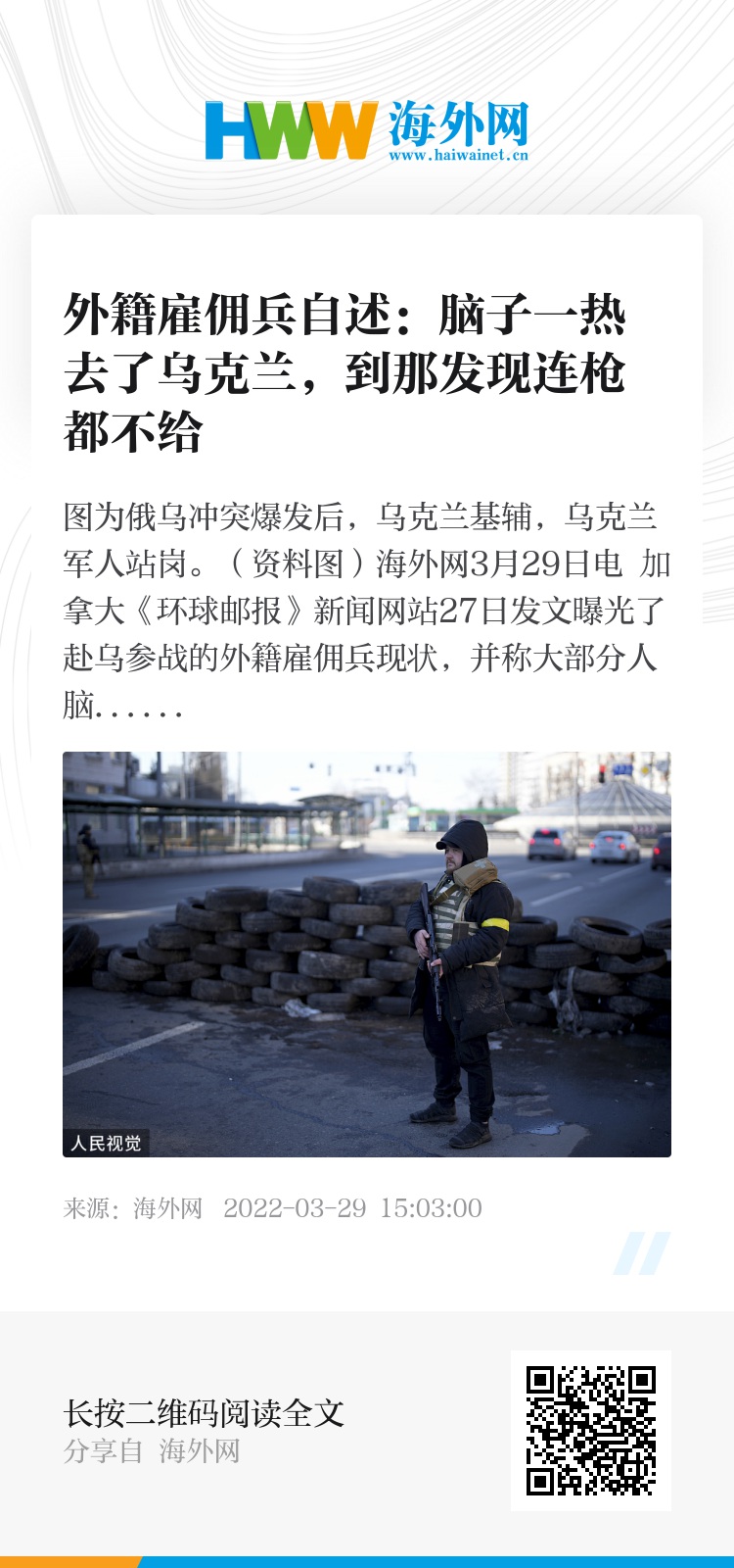 海外网3月29日电 加拿大《环球邮报》新闻网站27日发文曝光了赴乌参战的外籍雇佣兵现状,并称大部分人脑子一热就跑到乌克兰,到那才发现对方连枪都不给。