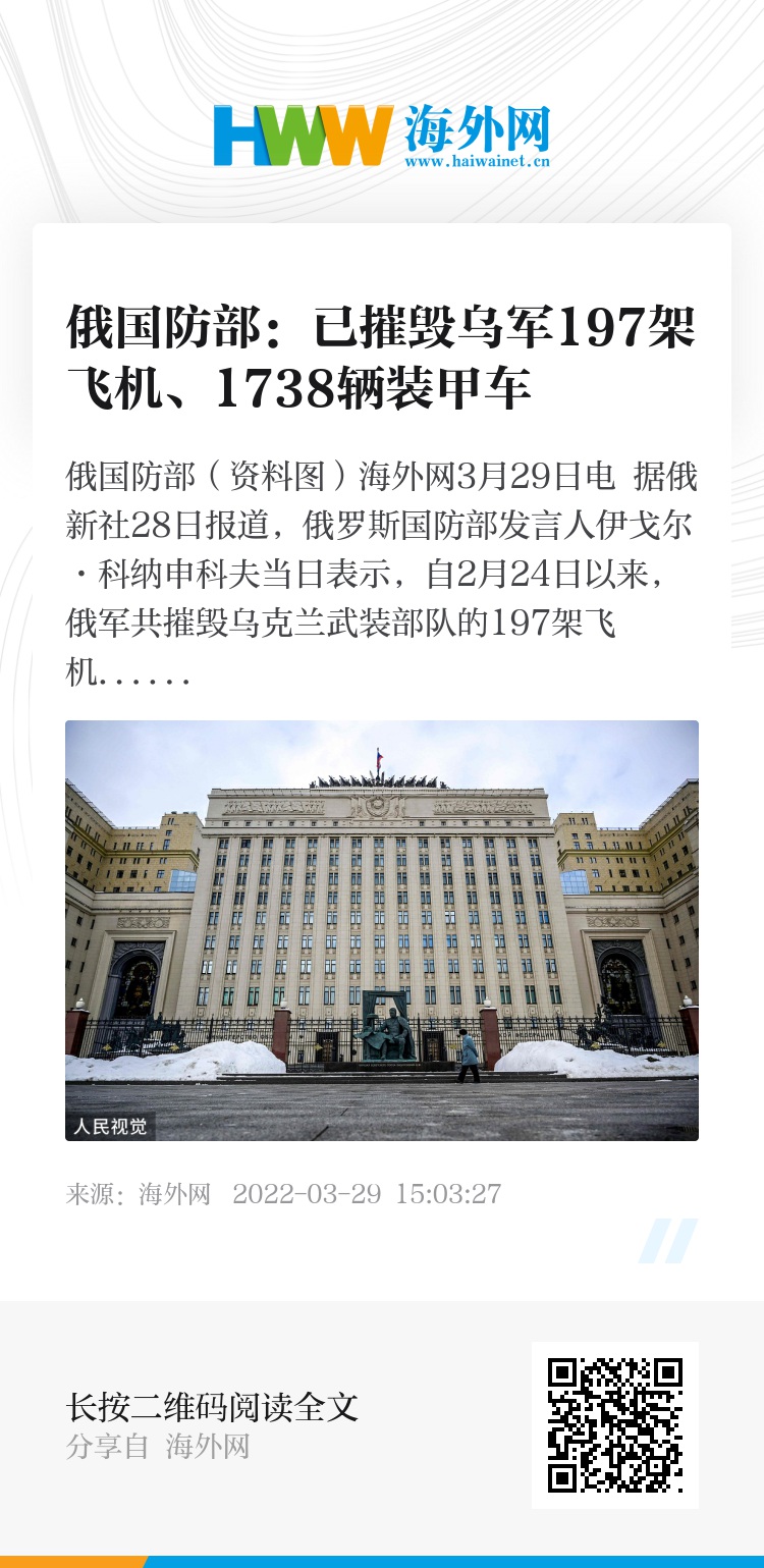 海外网3月29日电 据俄新社28日报道,俄罗斯国防部发言人伊戈尔·科纳申科夫当日表示,自2月24日以来,俄军共摧毁乌克兰武装部队的197架飞机、311架无人机、1738辆坦克和其他装甲车、181个多管火箭发射器、726门野战炮和迫击炮,以及1592辆特种军车。(海外网 张琪)