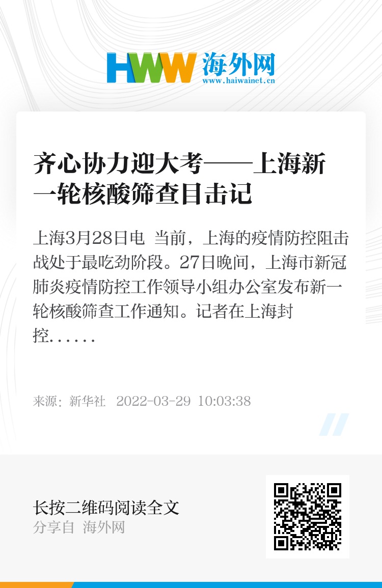 新华社上海3月28日电 当前,上海的疫情防控阻击战处于最吃劲阶段。27日晚间,上海市新冠肺炎疫情防控工作领导小组办公室发布新一轮核酸筛查工作通知。记者在上海封控区域看到,从居民到社区干部,从工厂到金融机构,各方正在携起手来迎接新一轮大考。