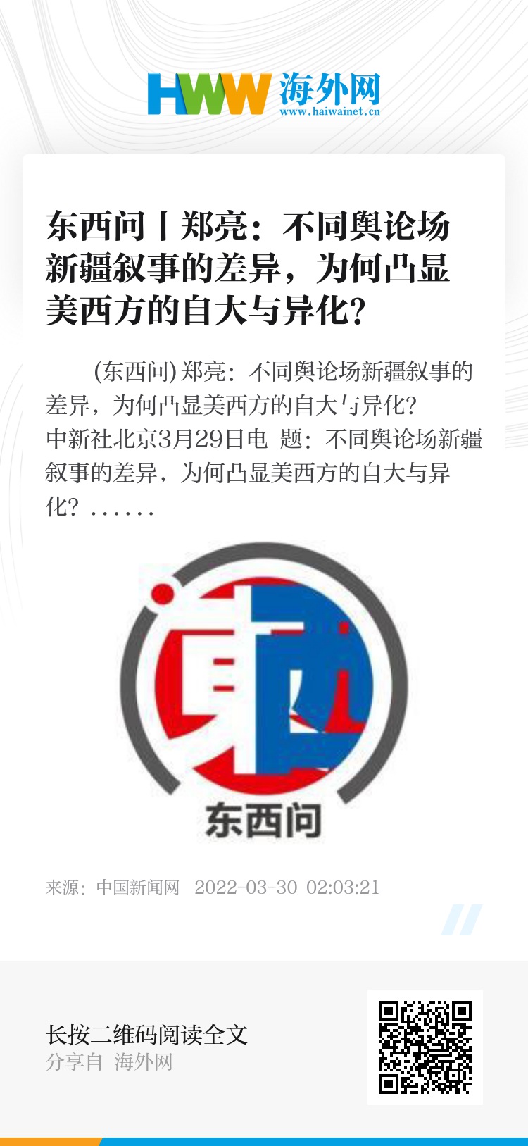 中新社北京3月29日电 题:不同舆论场新疆叙事的差异,为何凸显美西方的自大与异化?