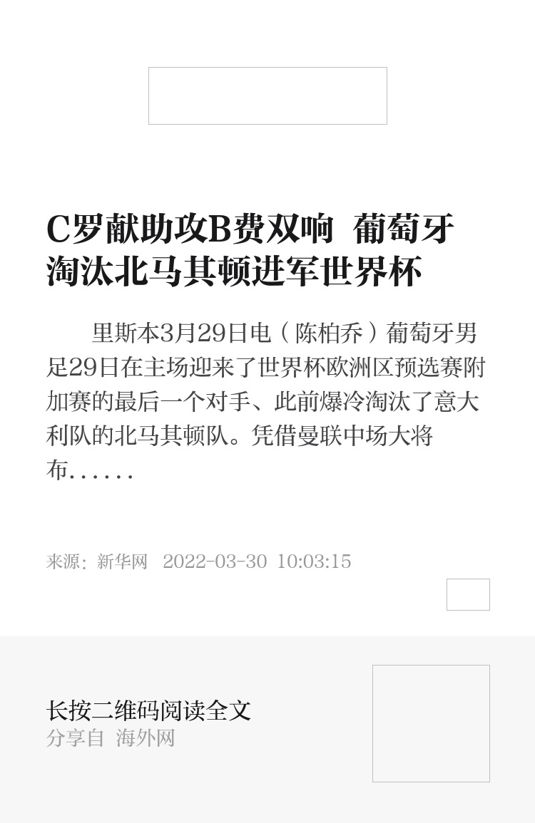 2022年卡塔尔世界杯将是37岁的C罗连续第五次参加世界杯。出线后的葡萄牙也已确定将在4月1日的小组抽签中成为种子球队。