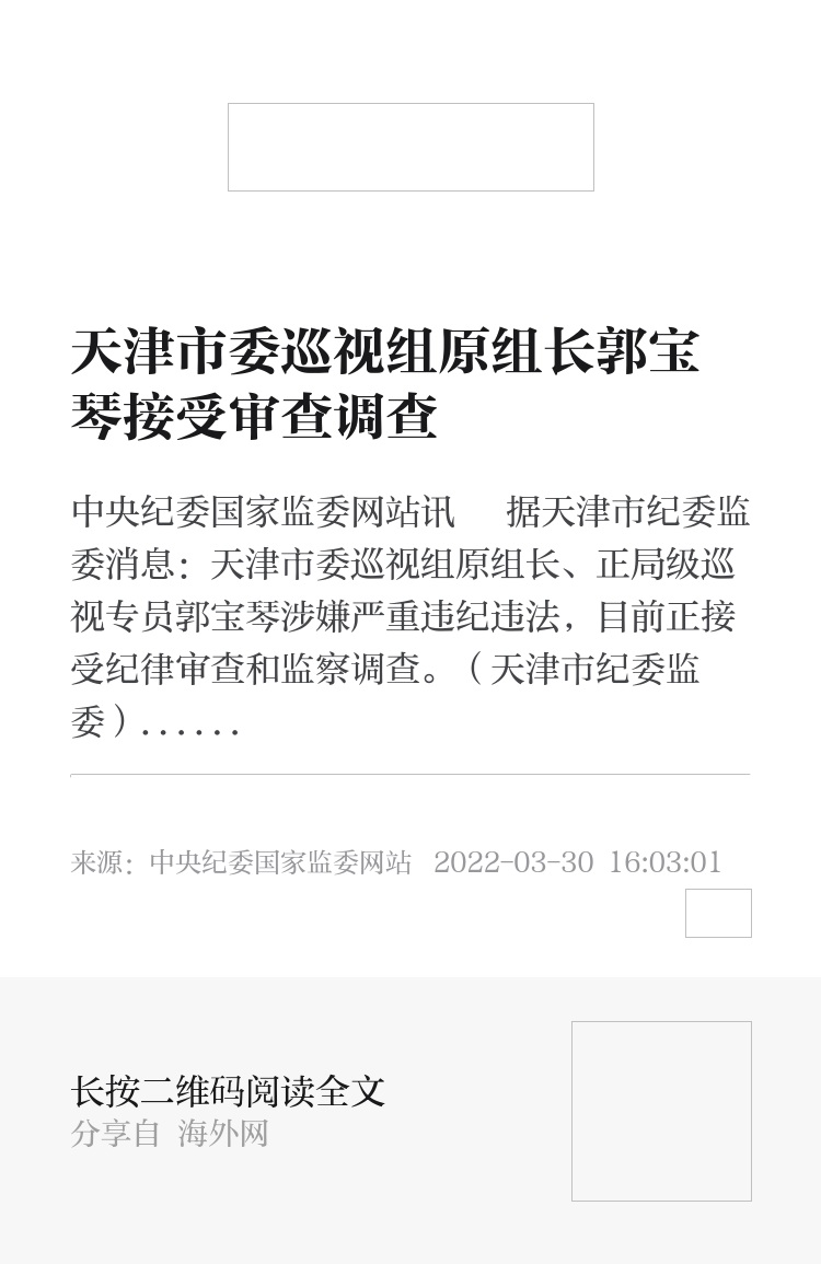 中央纪委国家监委网站讯 据天津市纪委监委消息:天津市委巡视组原组长、正局级巡视专员郭宝琴涉嫌严重违纪违法,目前正接受纪律审查和监察调查。