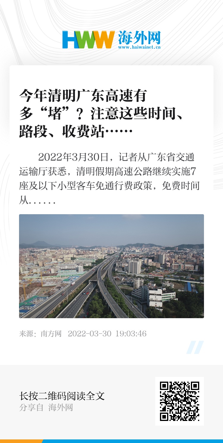 2022年3月30日,记者从广东省交通运输厅获悉,清明假期高速公路继续实施7座及以下小型客车免通行费政策,免费时间从4月3日0时至5日24时。