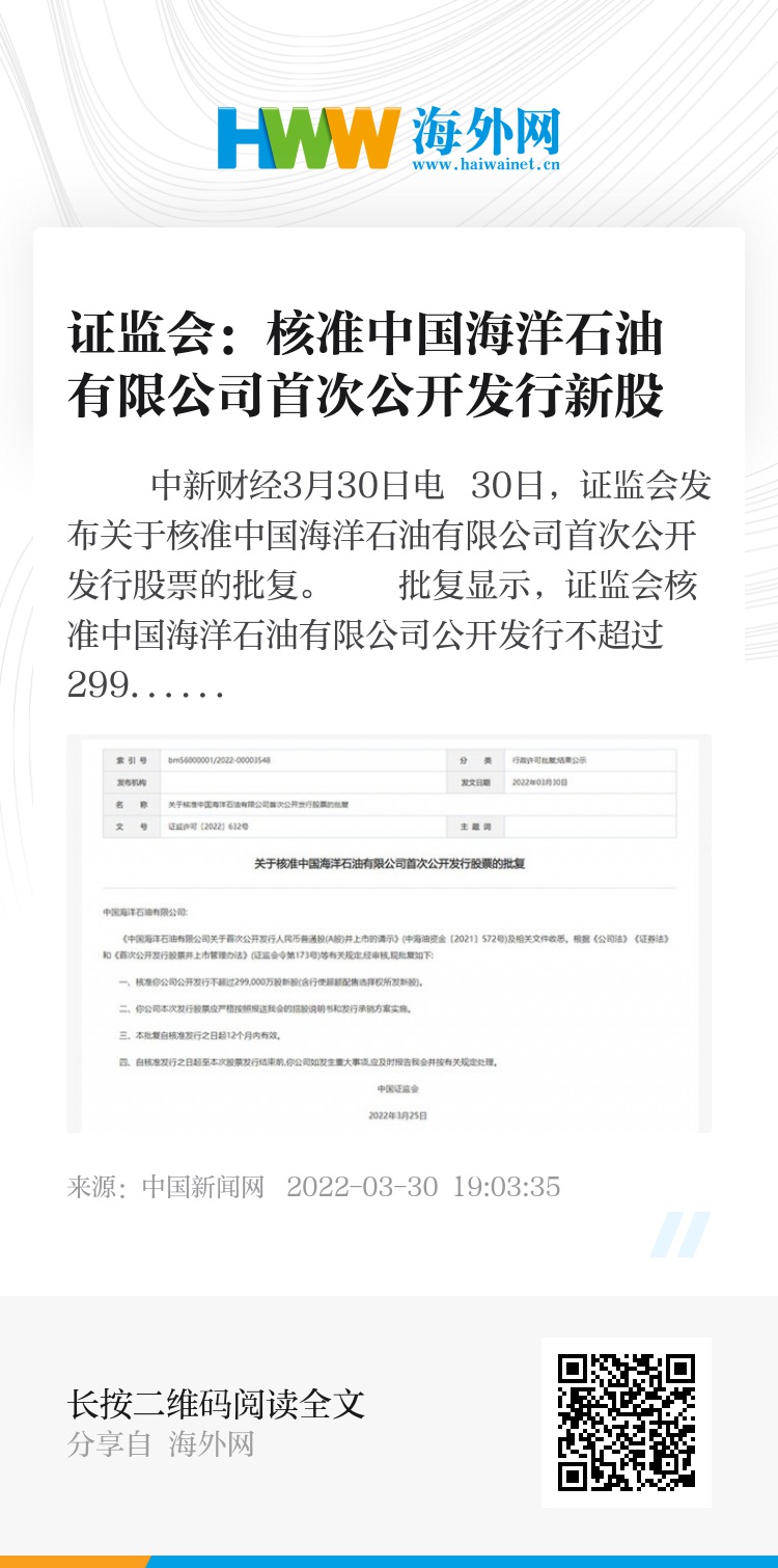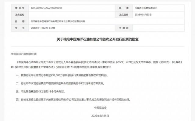 中新财经3月30日电 30日,证监会发布关于核准中国海洋石油有限公司首次公开发行股票的批复。