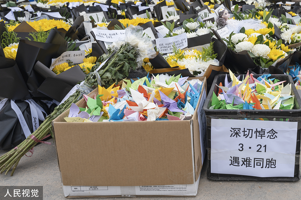 广西藤县:东航客机事故现场附近村口摆满悼念花束 群众献花遥寄哀思