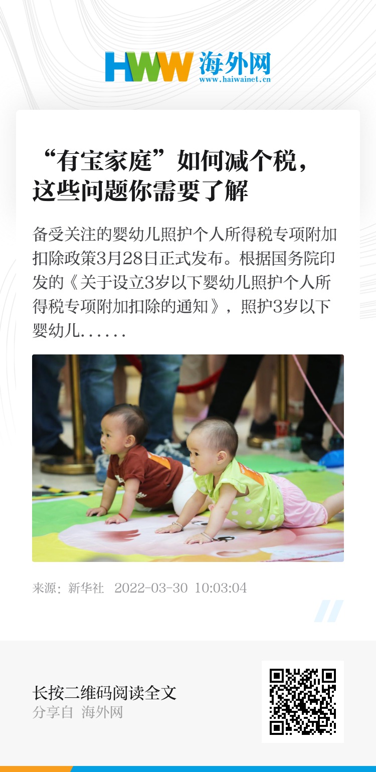 备受关注的婴幼儿照护个人所得税专项附加扣除政策3月28日正式发布。根据国务院印发的《关于设立3岁以下婴幼儿照护个人所得税专项附加扣除的通知》,照护3岁以下婴幼儿的纳税人,可以从今年1月1日起享受新的专项附加扣除。