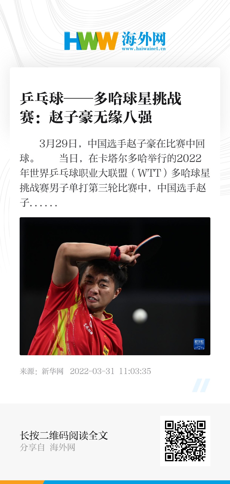 当日,在卡塔尔多哈举行的2022年世界乒乓球职业大联盟(WTT)多哈球星挑战赛男子单打第三轮比赛中,中国选手赵子豪以0比3不敌尼日利亚选手阿鲁纳,无缘八强。